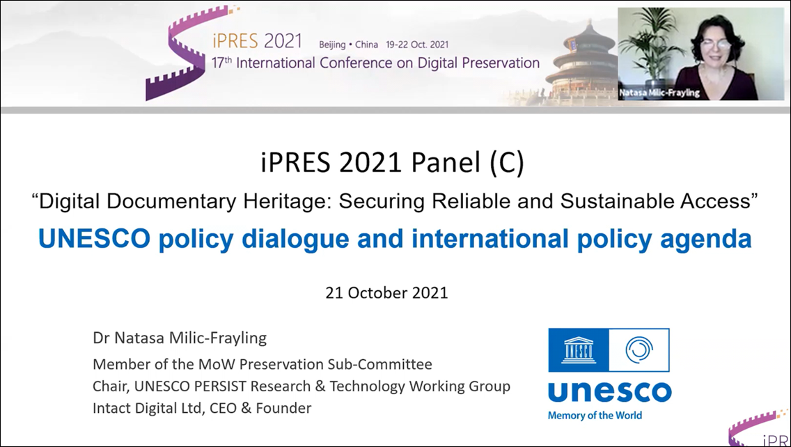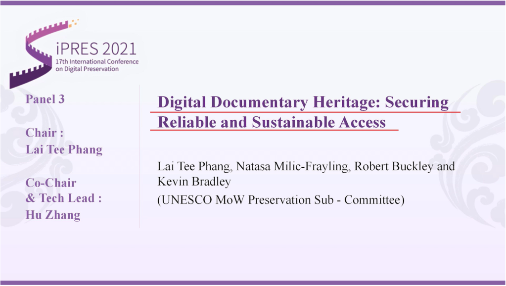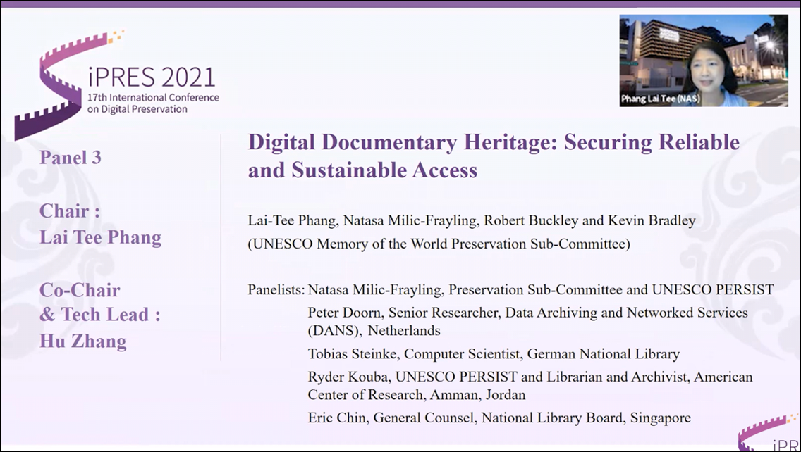 On 21 October 2021, as part of the iPRES 2021 conference, members of the UNESCO Memory of the World (MoW) Preservation Sub-Committee, Ms Lai Tee Phang (Chair), Ms Natasa Milic-Frayling, Mr Robert Buckley and Mr Kevin Bradley organized a panel on “Digital Documenter Heritage: Securing Reliable and Sustainable Access”
